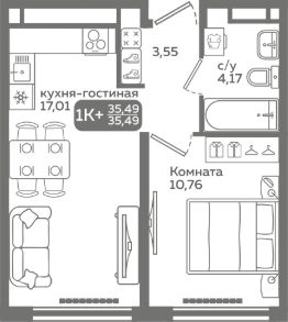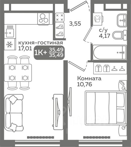 Прямая продажа от застройщика! Продается однокомнатная квартира в строящемся ЖК "Меридиан Слобода", срок сдачи: I-кв. 2027, общей площадью 35.49 м², на 14 этаже из 21. Площадь кухни — 17.01 м².