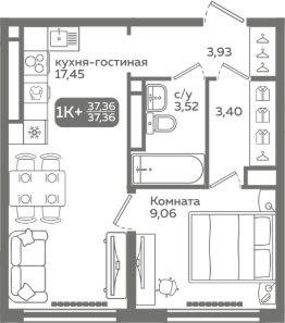Прямая продажа от застройщика! Продается однокомнатная квартира в строящемся ЖК "Меридиан Слобода", срок сдачи: I-кв. 2027, общей площадью 37.36 м², на 20 этаже из 21. Площадь кухни — 17.45 м².