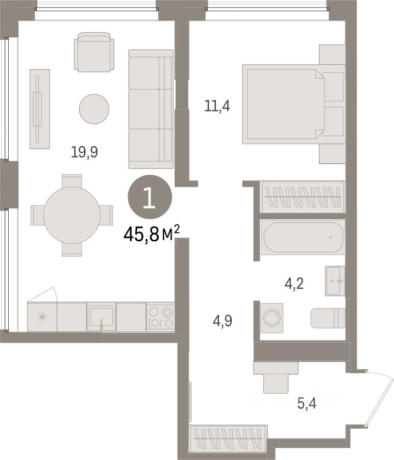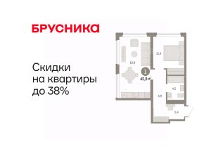 Квартира с кухней-гостиной и одной спальней в жилом районе "Речной порт". Особенности планировки: предчистовая отделка.