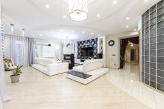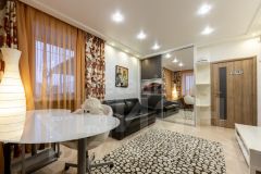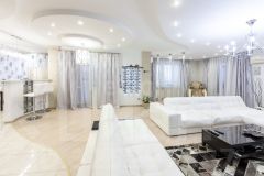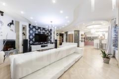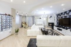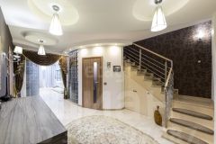 На первом этаже вас встретит великолепная кухня-гостиная, оформленная в светлом утонченном стиле, которая станет настоящей находкой для каждой хозяйки. Двухуровневые потолки придают пространству особую гармонию и уют, а камин в гостиной создаст атмосферу тепла и уюта для вечерних посиделок с близкими. Также здесь расположены шикарная сауна, постирочная и уникальная гардеробная, что делает повседневную жизнь еще более комфортной.