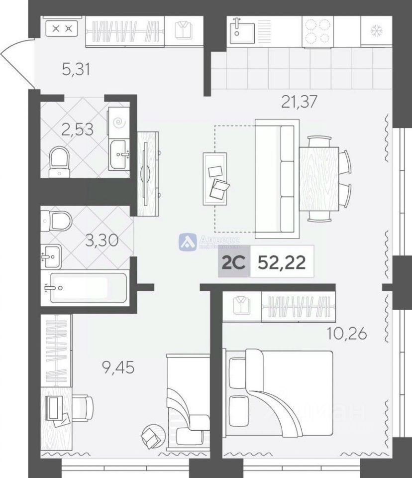 Продаётся уютная двухкомнатная квартира в новом жилом комплексе на 6 этаже. Общая площадь квартиры составляет 52.22 кв.м., из них на кухню приходится 21.37 кв.м. Это отличное предложение для тех, кому важны комфорт и удобство.