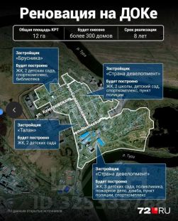 >>План комплексного развития территории (КРТ) района ДОК в Тюмени включает строительство нового микрорайона с жилыми домами от 9 до 25 этажей, двумя школами, четырьмя детскими садами, дамбой для защиты от наводнений, пешеходным бульваром, спортивными зонами и общественными пространствами, а также мостом через Туру, соединяющим район с Зарекой. Реализация проекта рассчитана до 2032-2033 годов и осуществляется силами нескольких крупных застройщиков