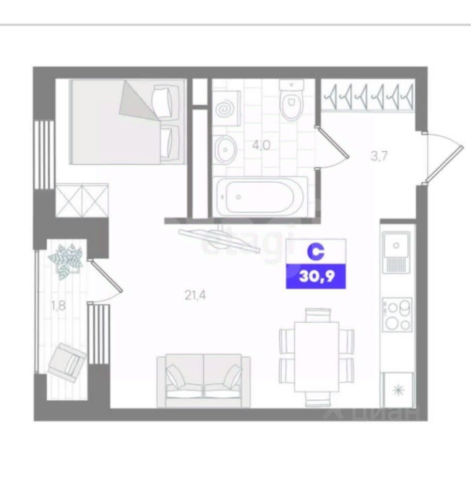 Квартира площадью 30.9 кв.м. , видовой этаж, спальное место зонировано - вы получаете однокомнатную квартиру по цене студии!