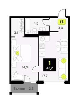 Однокомнатная квартира в ЖК "Дивный квартал у озера" на 6 этаже. Общая площадь: 43.2 кв.м. Высота потолков 2.7 м.