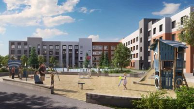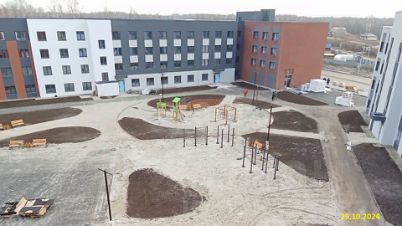 Автомобили размещены на периферийных парковках, что способствует тихой и экологичной среде. Озеленение территории реализовано по ландшафтному проекту с использованием неприхотливых растений, адаптированных к сибирскому климату.