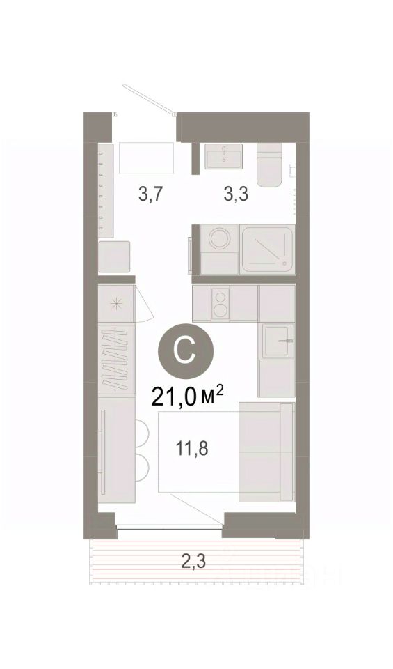 Студия в Октябрьском на Туре. Особенности планировки: балкон, предчистовая отделка.