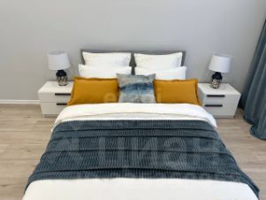 В светлой спальне большая кровать с матрасом, прикроватные тумбы. Из спальни Вы попадаете в большую гардеробную (5,6 кв.м) с организованной системой хранения.