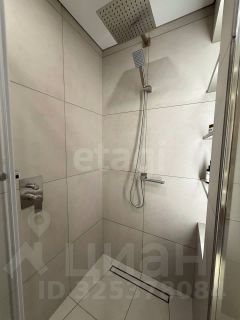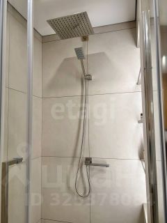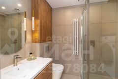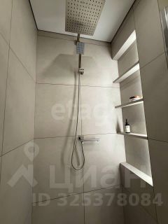 Просторная душевая зона оборудована четырьмя полками и скрытой сантехникой.