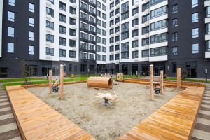 Безопасный закрытый двор с игровыми зонами раделенными по возрастам детей.
