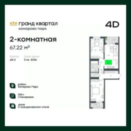Продаётся 2-комнатная квартира в строящемся доме (Д4.2 (Малкова, 3)), срок сдачи: III-кв. 2026, общей площадью 67.22 кв.м., на 18 этаже. Компания 4D приступила к строительству нового жилого комплекса "Гранд квартал". Новый ЖК находится в зеленой зоне Калининского района, южнее микрорайона Тюменская слобода.