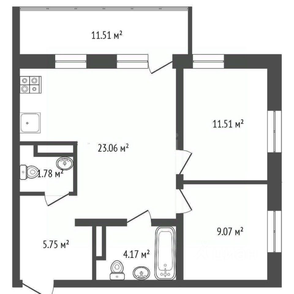 Внутреннее пространство включает в себя уютную кухню-гостиную площадью 23,06 м², две светлые спальни (9.07 м² и 11,51 м²), функциональных 2 санузла 4.17 и 1.78 м² и коридор 5,75 м².