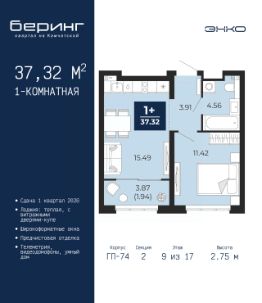 Продается однокомнатная квартира от застройщика с предчистовой отделкой в ЖК "Беринг" на 9 этаже. Общая площадь: 37.32 кв.м., жилая: 11.42 кв.м., площадь просторной кухни-столовой: 15.49 кв.м. Все окна выходят на одну сторону. В квартире одна лоджия, один совмещенный санузел. Высота потолков 2.75 м.