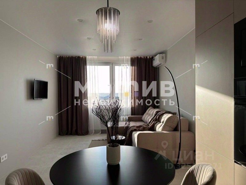 В кухне-гостиной: большой раскладной диван, телевизор, кондиционер. Кухня по дизайн-проекту с качественной встраиваемой техникой Weissgauff (варочная панель, духовой шкаф, микроволновая печь, холодильник, посудомоечная машина, вытяжка), уютная столовая зона (стол, мягкие стулья). Стиральная машинка расположена в закрытом пенале.