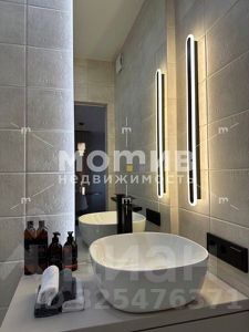 Ремонт выполнен в современном стиле, экологичными материалами: на полу керамогранит, стены покрашены, потолок натяжной, зонированная система освещения (светодиодные подсветки, светильники), сенсорные умные выключатели с функцией Алиса, система Умный дом, датчики затопления. В квартире горизонтальная система отопления, пол теплый, радиаторы хорошего качества.