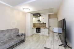 Продается уютная евродвушка с современным ремонтом в кирпичном доме индивидуального проекта. Кухня-гостинная 15 кв.м. Большой сан.узел. 6 кв.м. и спальня 12 кв.м. с выходом на балкон и вместительной гардеробной. В квартире выполнен современный ремонт: ламинат, стены выровнены под маяк, в санузле - кафель, ремонт в очень хорошем состоянии. Квартира - заезжай и живи. Окна выходят на юг, но летом в квартире не жарко, а зимой тепло. Большая лоджия остеклена. При продаже остается современный кухонный гарнитур с техникой. 2 встроенных шкафа. Другая мебель остается по договоренности. Инфраструктура района любима жителями Тюмени: рядом Гагаринский парк, Сити-Молл, школа 48, детские сады, источники с минеральной водой. быстрый выезд на объездную и доступность нескольких трактов. Звоните, договоримся на показ в любое, удобное для Вас время.