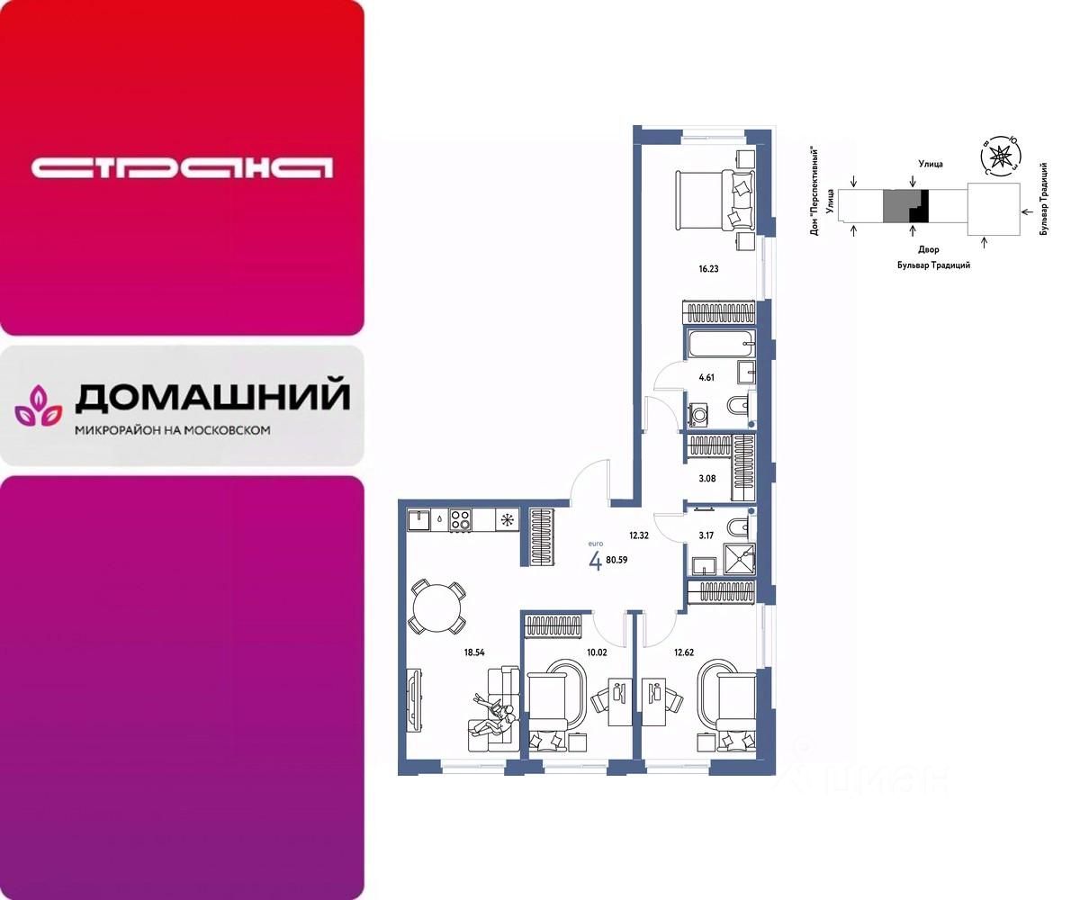 Продается 4комнатная квартира на 10 этаже от застройщика Страна Девелопмент. Площадь квартиры 80,59 кв. м.