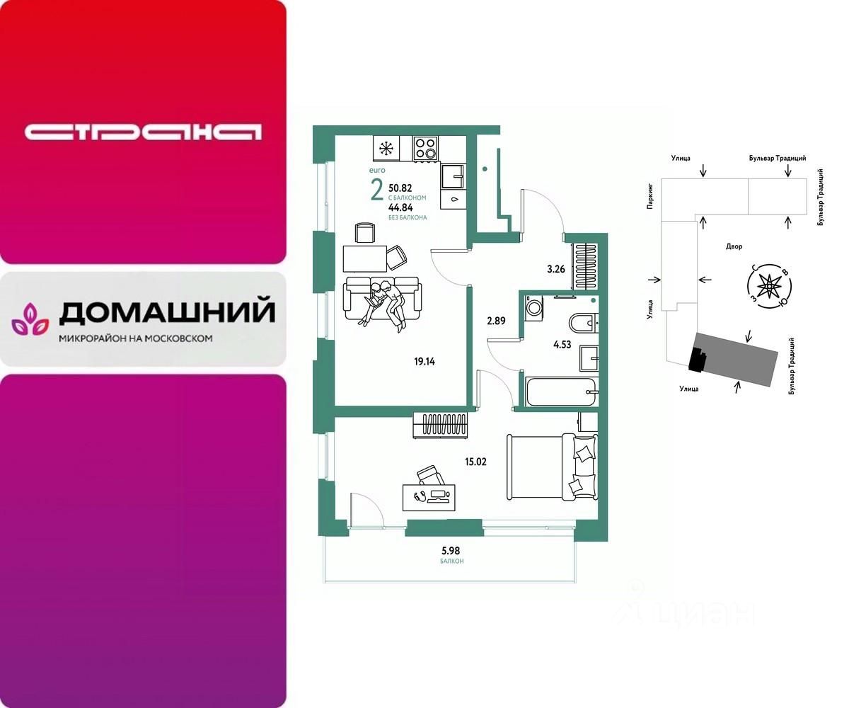 Продается 2комнатная квартира на 11 этаже от застройщика Страна Девелопмент. Площадь квартиры 50,82 кв. м.