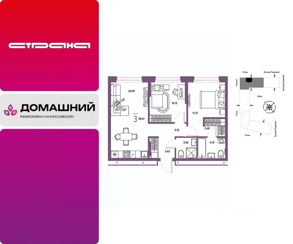 Продается 3комнатная квартира на 8 этаже от застройщика Страна Девелопмент. Площадь квартиры 58,61 кв. м.