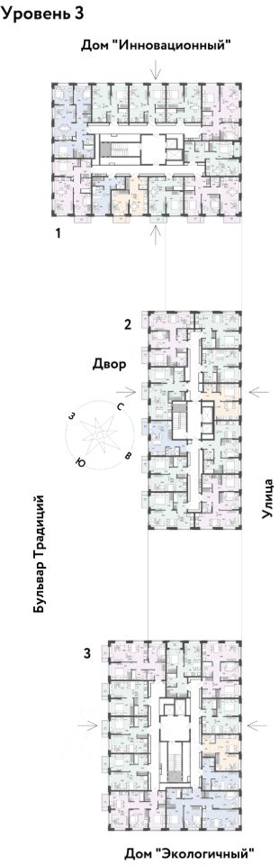 Внутри микрорайона появится огромный пешеходный бульвар — бульвар Традиций. Центром притяжения станут открытые пространства для отдыха жителей и гостей микрорайона, которые легко меняются под сезонные сценарии отдыха: новогодняя елка, ярмарки, кинопоказы и т.д.