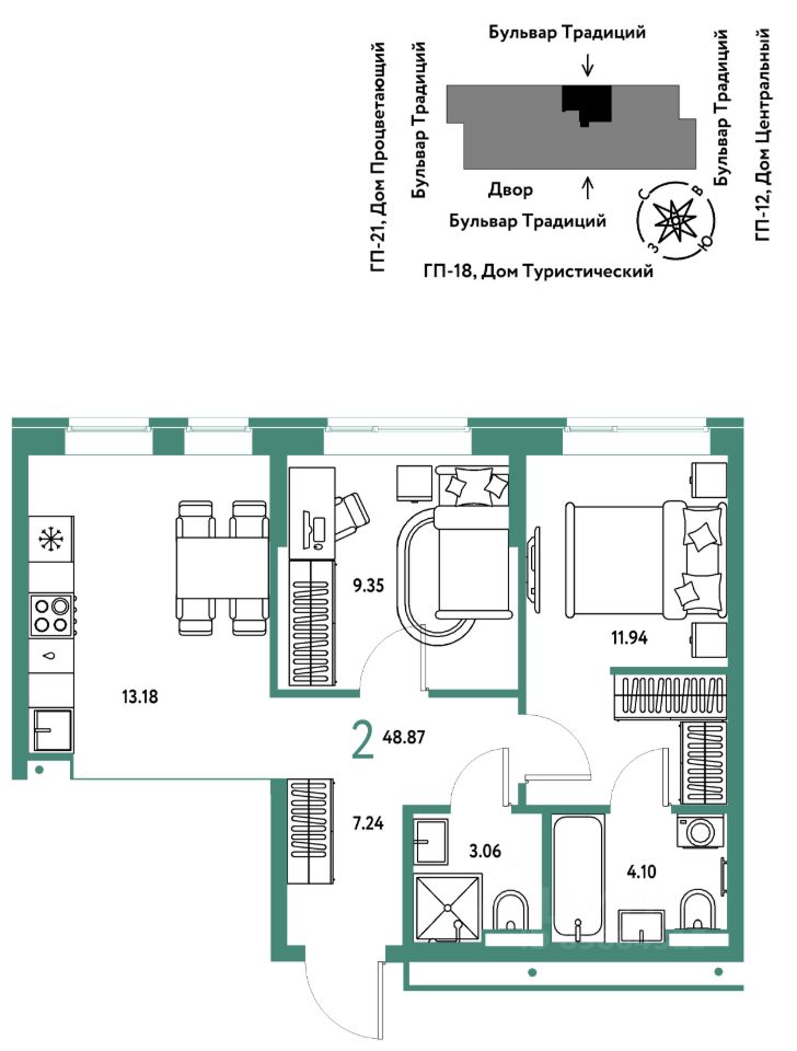 Продается 2комнатная квартира на 2 этаже от застройщика Страна Девелопмент. Площадь квартиры 48,87 кв. м.