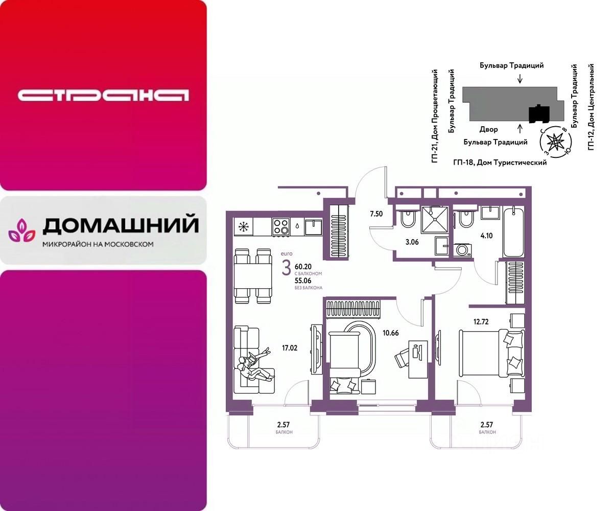 Продается 3комнатная квартира на 3 этаже от застройщика Страна Девелопмент. Площадь квартиры 60,2 кв. м.