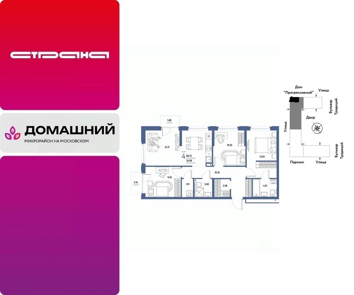 Продается 4комнатная квартира на 5 этаже от застройщика Страна Девелопмент. Площадь квартиры 80,13 кв. м.