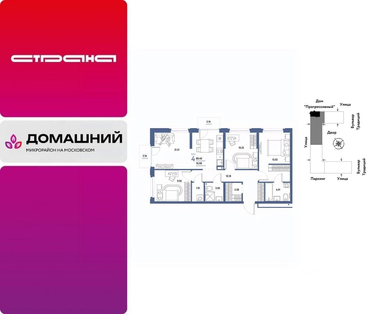 Продается 4комнатная квартира на 8 этаже от застройщика Страна Девелопмент. Площадь квартиры 80,4 кв. м.