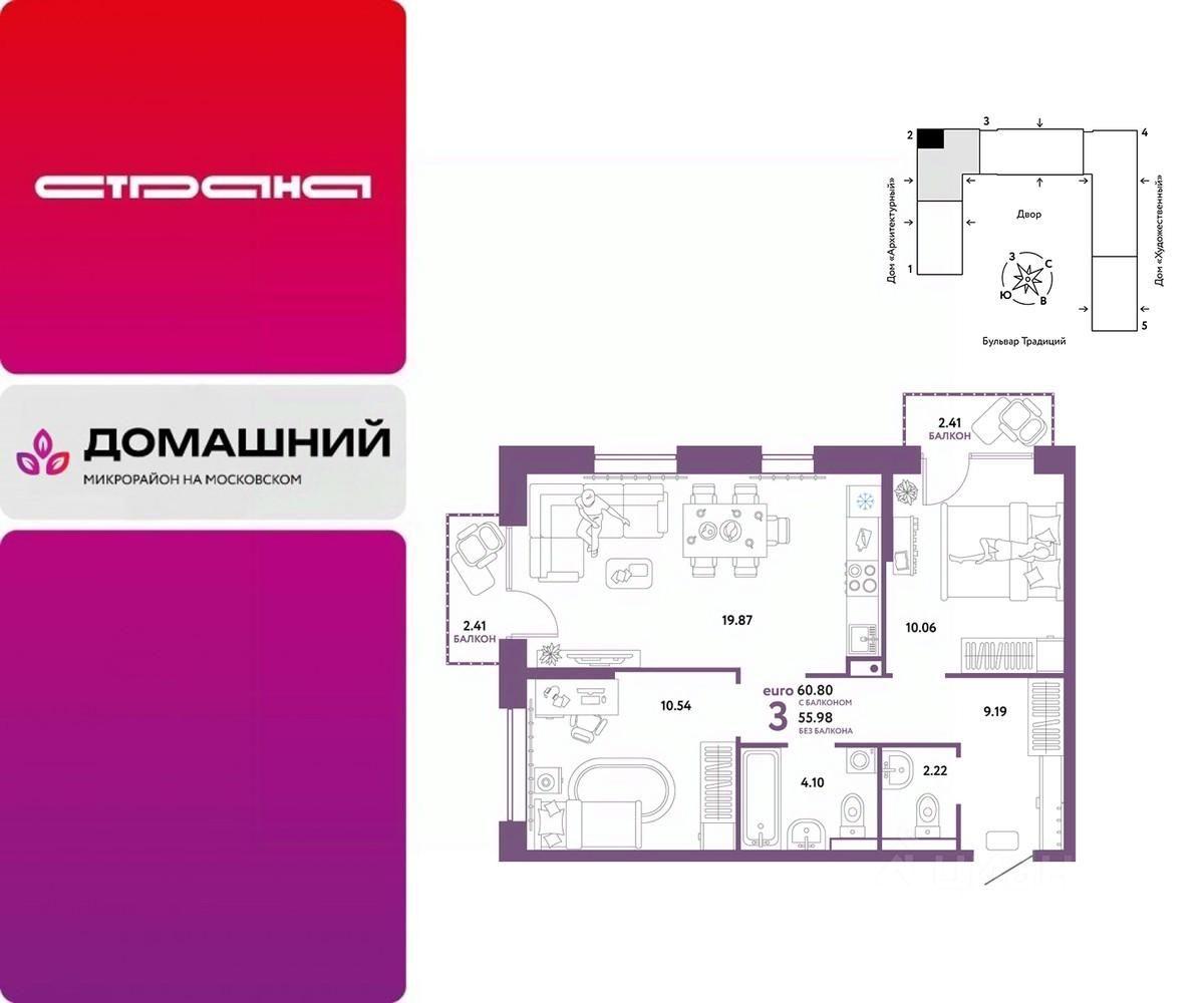 Продается 3комнатная квартира на 4 этаже от застройщика Страна Девелопмент. Площадь квартиры 60,8 кв. м.