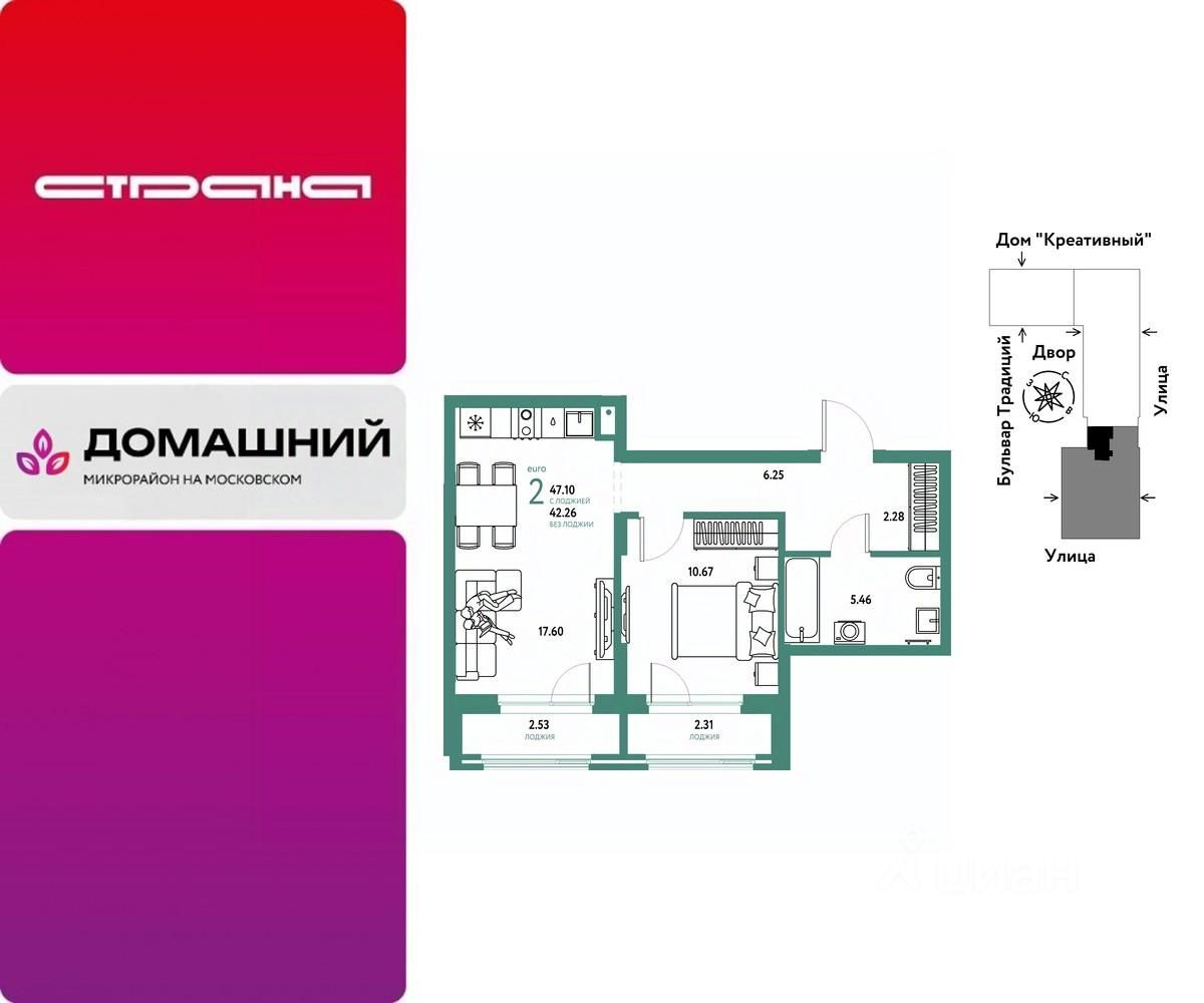 Продается 2комнатная квартира на 5 этаже от застройщика Страна Девелопмент. Площадь квартиры 47,1 кв. м.