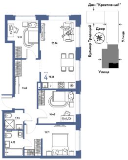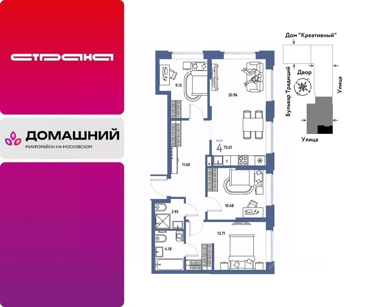 Продается 4комнатная квартира на 10 этаже от застройщика Страна Девелопмент. Площадь квартиры 73,01 кв. м.