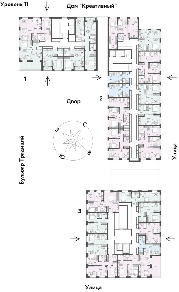 -Сквозные парадные с прозрачными входными группами, колясочными и велосипедными