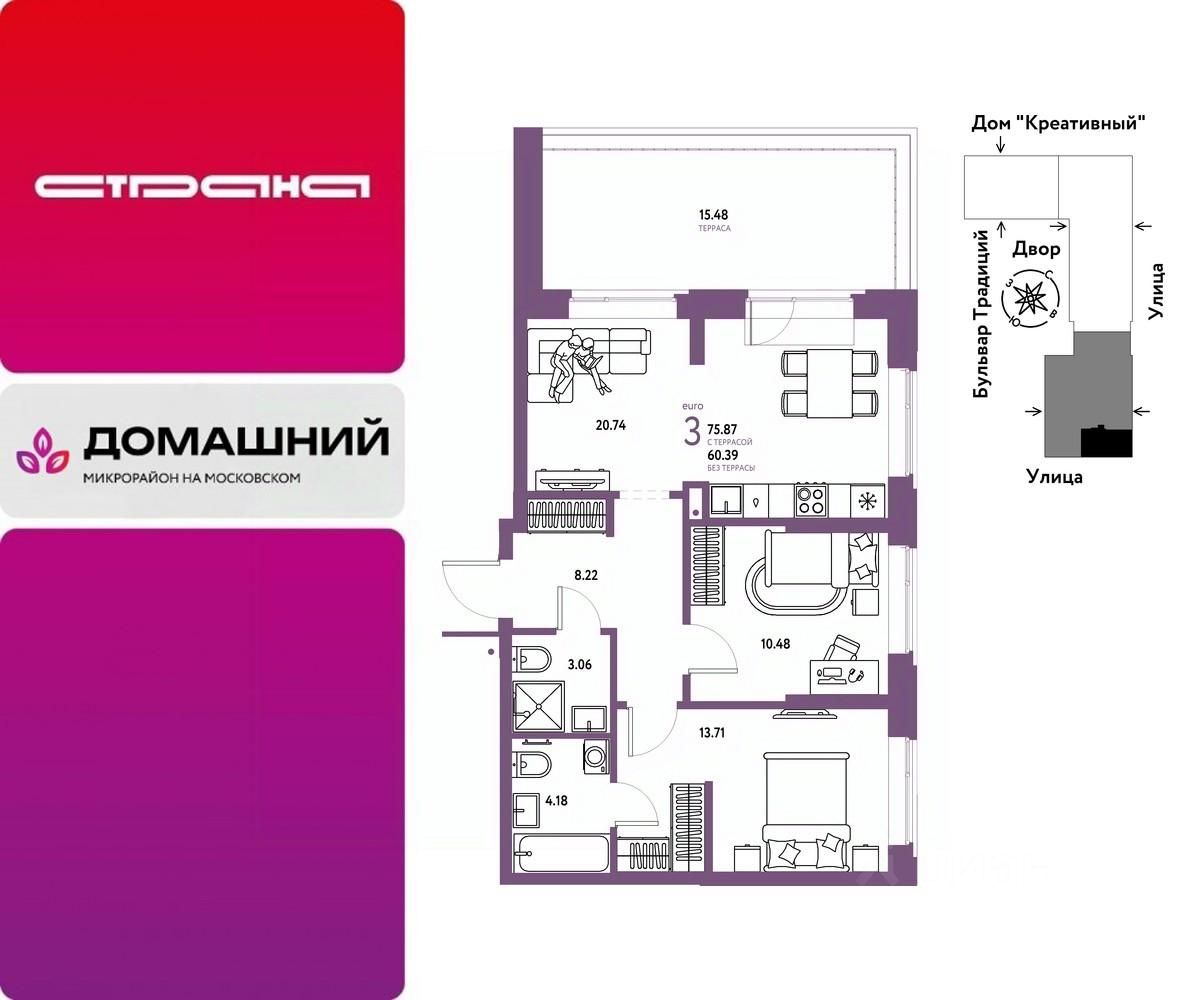 Продается 3комнатная квартира на 11 этаже от застройщика Страна Девелопмент. Площадь квартиры 75,87 кв. м.