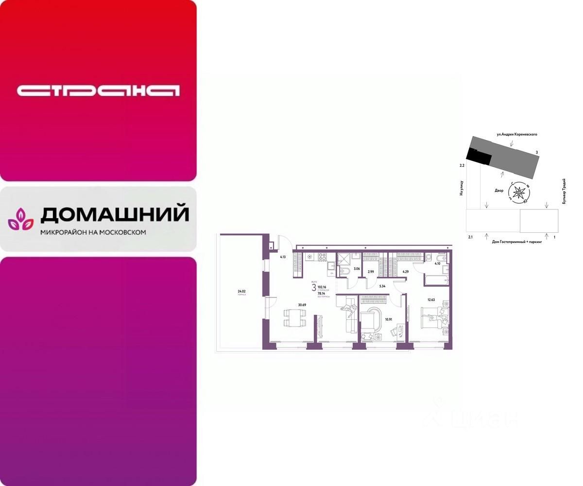 Продается 3комнатная квартира на 12 этаже от застройщика Страна Девелопмент. Площадь квартиры 102,16 кв. м.
