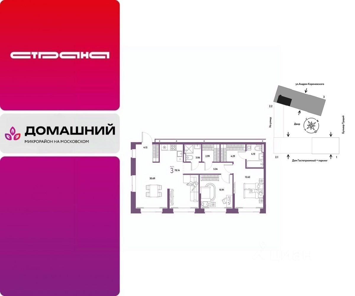 Продается 3комнатная квартира на 13 этаже от застройщика Страна Девелопмент. Площадь квартиры 78,14 кв. м.