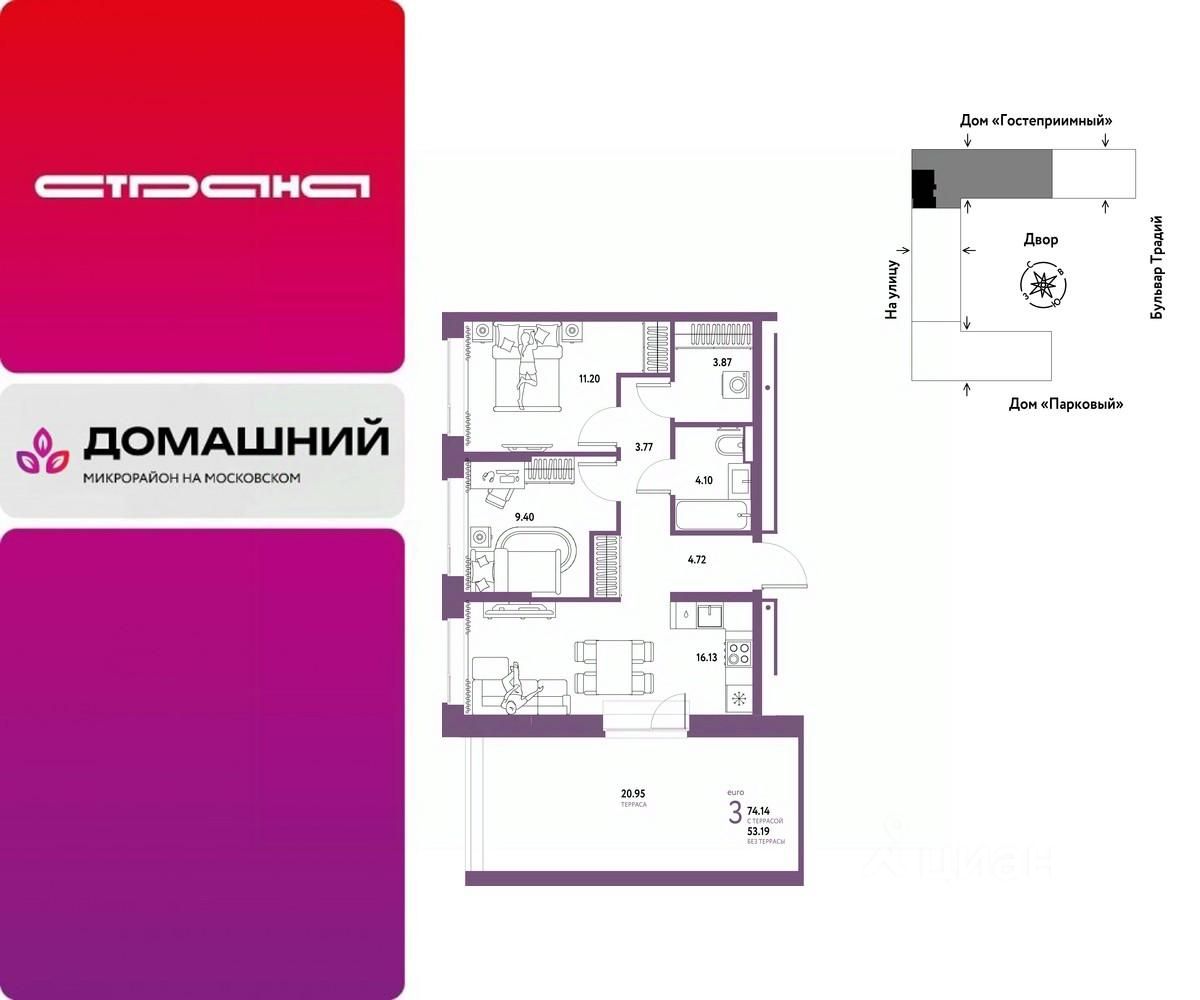 Продается 3комнатная квартира на 14 этаже от застройщика Страна Девелопмент. Площадь квартиры 74,14 кв. м.