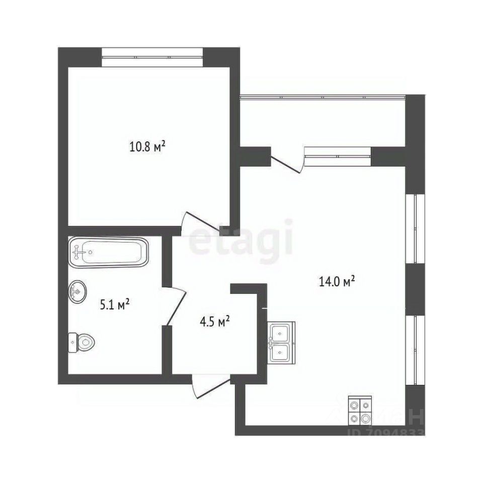 теплая лоджия 2.0 м2, кухня-гостиная 14 м2, санузел 5 м2, спальня 11 м2;
