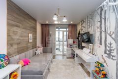 В детской комнате без труда разместится двое детей. Пространство оборудовано шведской стенкой, столом для занятий и вместительными стеллажами для хранения игрушек и книг.