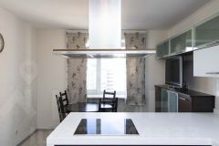 Кухня оснащена гарнитуром Giulia Novars и полным комплектом бытовой техники премиум-класса (телевизор, холодильник, вытяжка, встроенные плита, духовой шкаф, микроволновая печь посудомоечная машина, измельчитель отходов, стиральная машина).