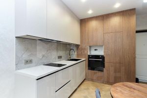 - Практичный кухонный гарнитур с увеличенными верхними шкафами;