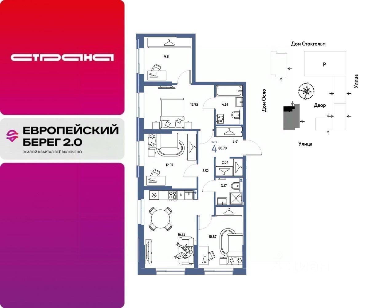 Продается 4комнатная квартира на 2 этаже от застройщика Страна Девелопмент. Площадь квартиры 80,7 кв. м.