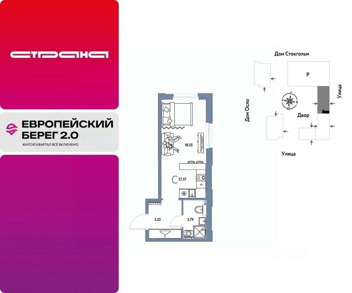Продается 1комнатная квартира на 19 этаже от застройщика Страна Девелопмент. Площадь квартиры 27,57 кв. м.
