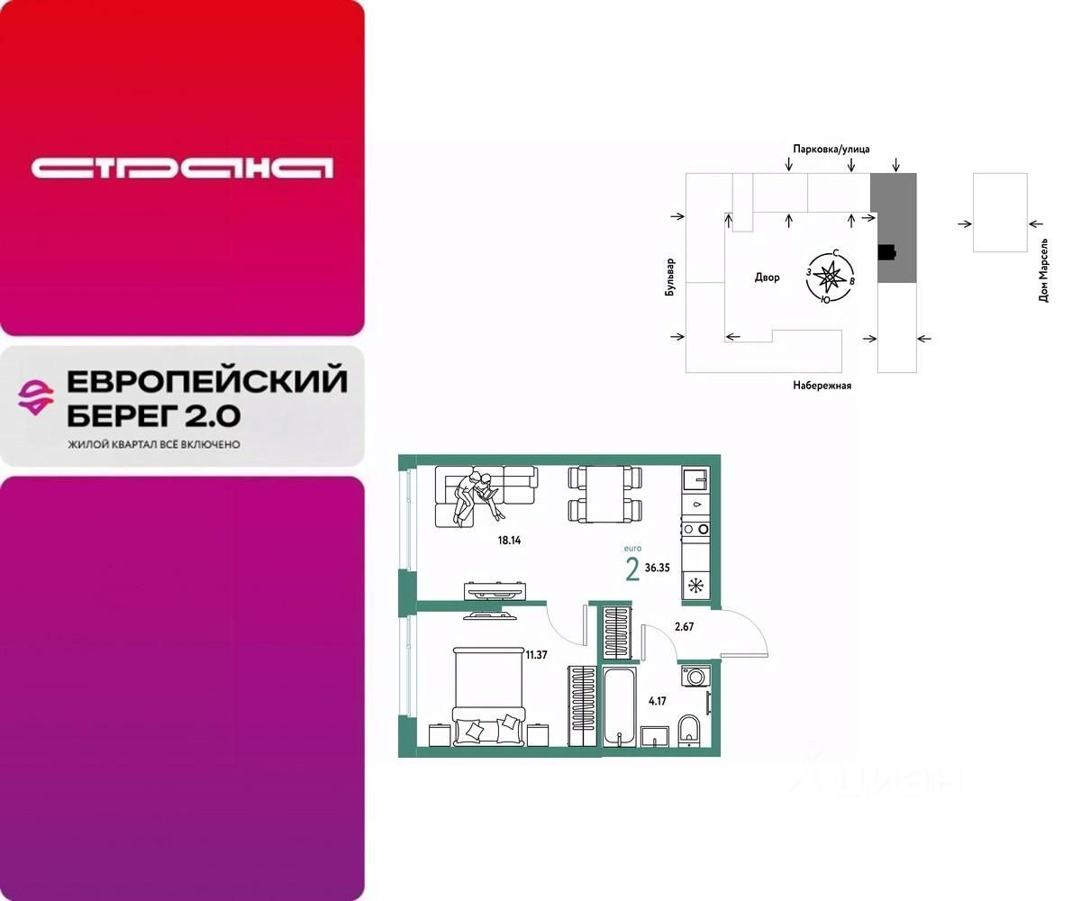 Продается 2комнатная квартира на 12 этаже от застройщика Страна Девелопмент. Площадь квартиры 36,35 кв. м. Стоимость указана без учета акций.