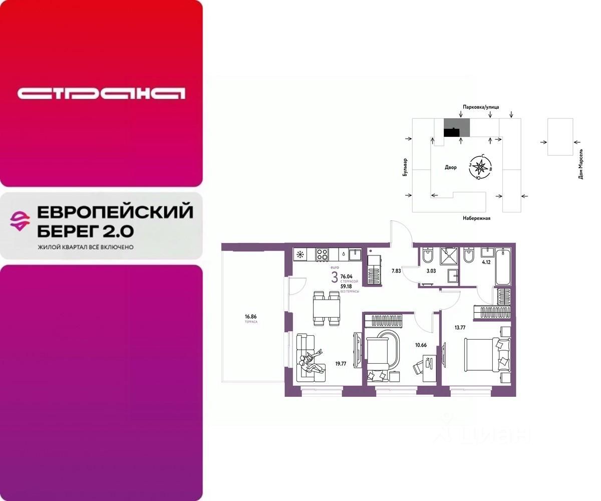 Продается 3комнатная квартира на 13 этаже от застройщика Страна Девелопмент. Площадь квартиры 76,04 кв. м. Стоимость указана без учета акций.