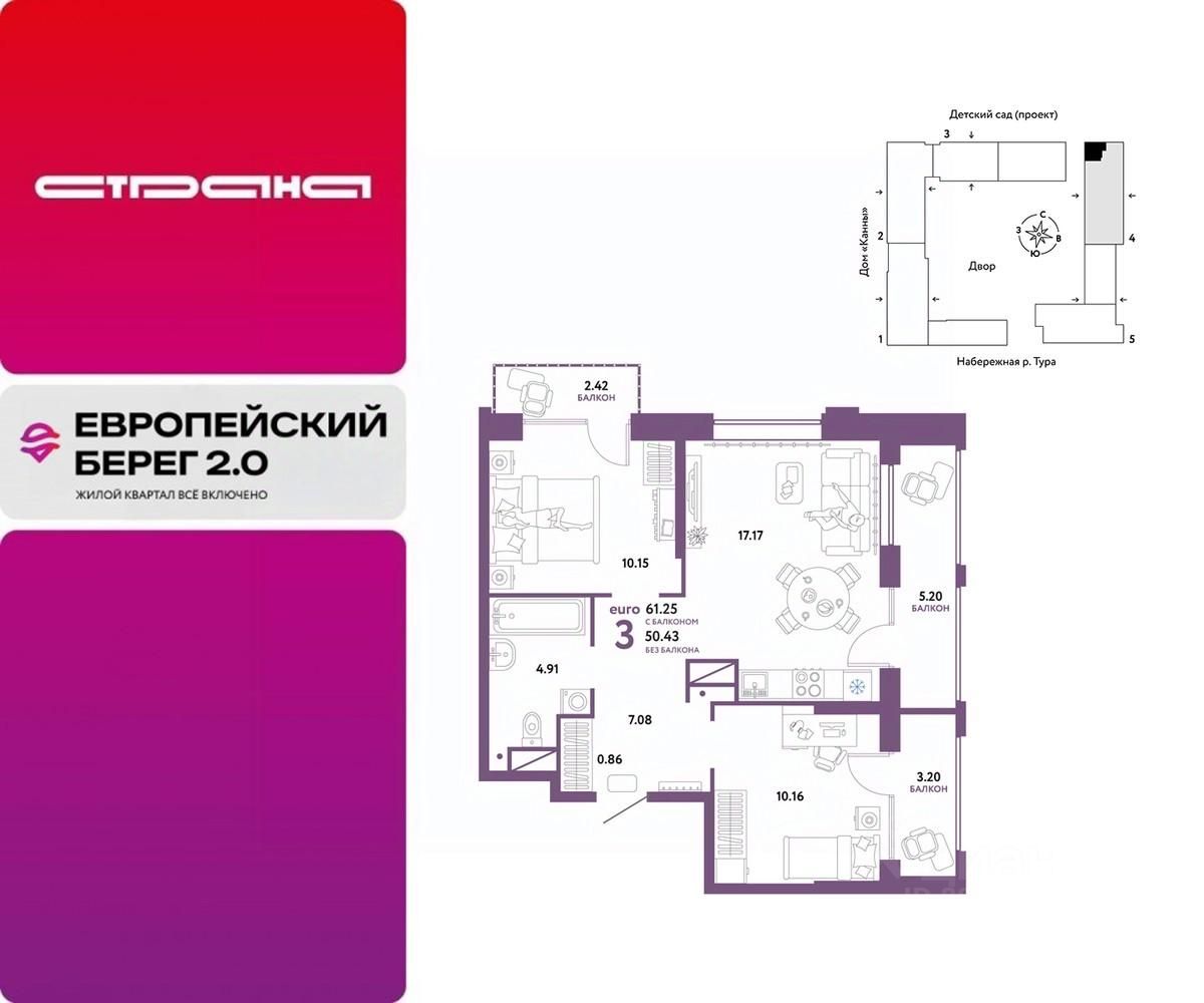 Продается 3комнатная квартира в новом ЖК "Европейский берег". Общая площадь квартиры 61,25 кв. м. Сдача — в 4 квартале 2025 года.