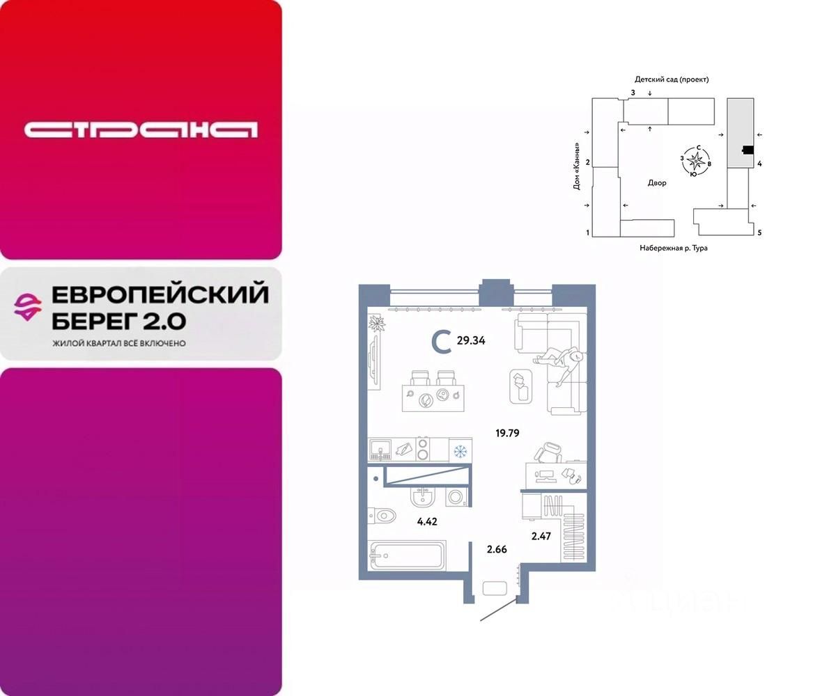 Продается 1комнатная квартира в новом ЖК "Европейский берег". Общая площадь квартиры 29,34 кв. м. Сдача — в 4 квартале 2025 года.