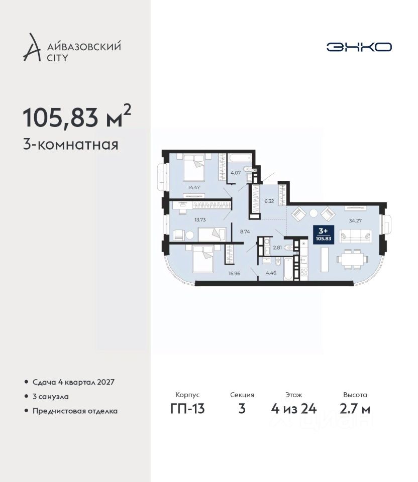 3-комн. квартира от застройщика с предчистовой отделкой в ЖК "Айвазовский City" на 4 этаже. Общая площадь: 105.83 кв.м., жилая: 45.16 кв.м., площадь просторной кухни-столовой: 34.27 кв.м. Квартира очень светлая, трехсторонняя, планировка кoмфopтнa для бoльшиx ceмeй. В квартире два совмещенных и один раздельный санузел. Высота потолков 2.7 м.