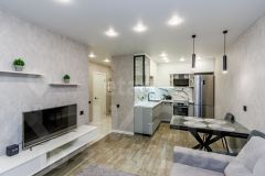 Общая площадь составляет 37,46 кв. м. Просторная и функциональная кухня-гостиная: 17,98 кв. м.