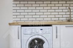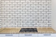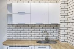 В кухне белый кухонный гарнитур со встроенной варочной панелью, также есть холодильник.