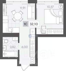 Продаётся уютная и светлая однокомнатная квартира в новом жилом комплексе. Квартира находится на 4 этаже, общей площадью 32,10 кв.м. В квартире предусмотрена просторная кухня площадью 11,91 кв.м.