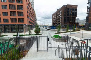 Стилобатные дворы формируют приватную территорию, защищенную от шума, грязи и посторонних глаз.